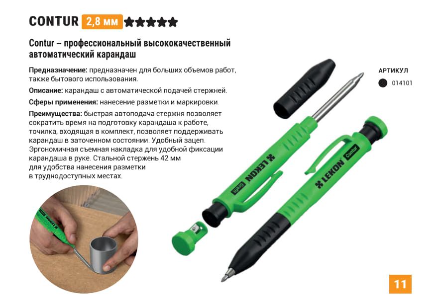 в заточенном состоянии. Удобный зацеп. Эргономичная съемная накладка для удобной фиксации карандаша в руке. Стальной стержень 42 мм для удобства нанесения разметки в труднодоступных местах.